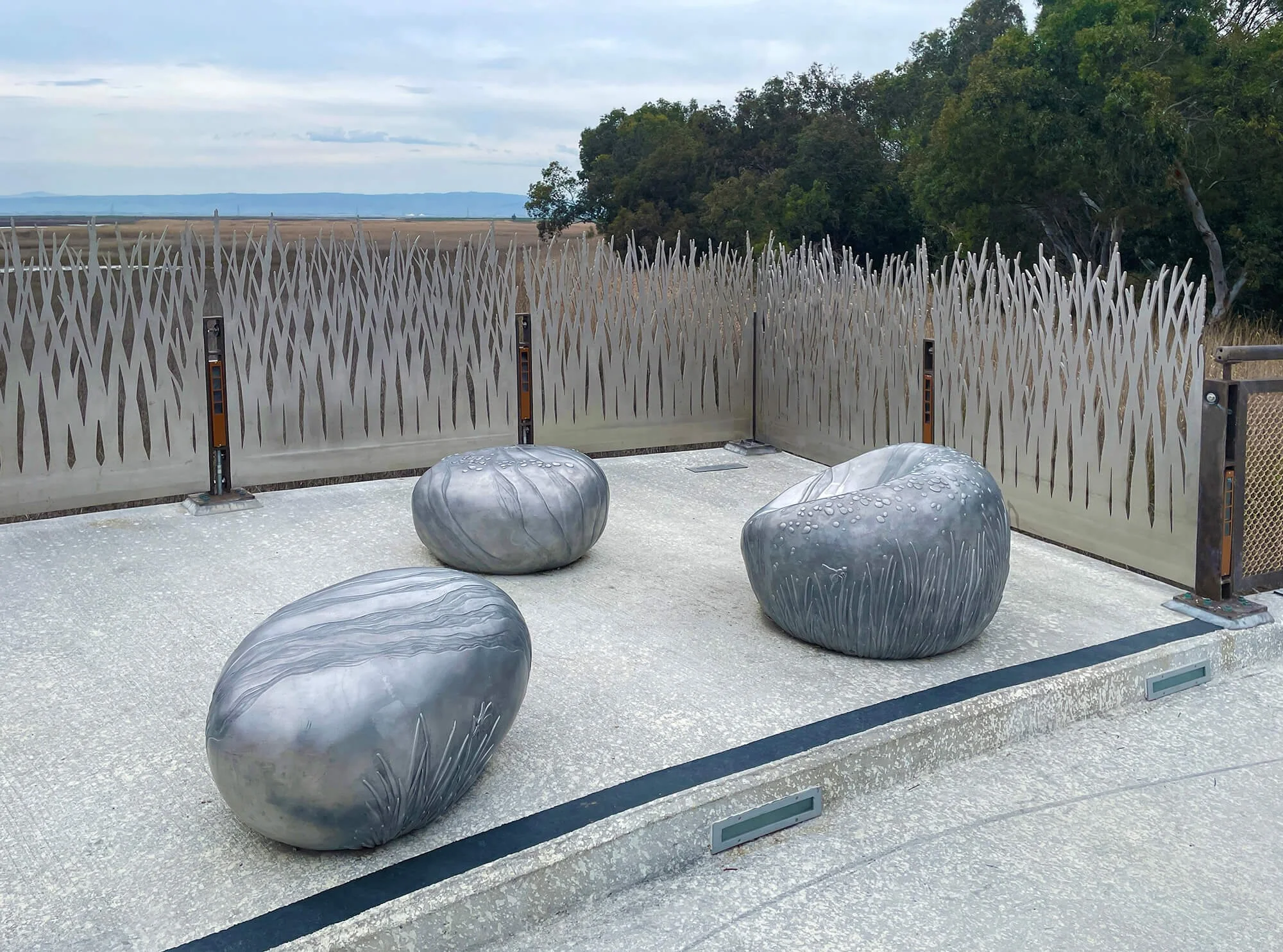 A new pedestrian bridge connects a Palo Alto neighborhood with a badlands park. The bridge is huge and the art budget was small, so I decided to concentrate all the art on a balcony on the bridge, overlooking the baylands. I wanted to create a space for people to stop and rest, that reflected the feeling of being down in the marsh, surrounded by grasses, ripples, stones, birds, and insects. The centerpiece of the site are three cast-aluminum sculptures that can be used as seating for a short rest. Organic-shaped and featuring textures from the grassland, the smooth surfaces beg to be touched. Part water-smoothed stone, part hand-polished old tableware, they both full of familiar references, and also very strange. The sculptures are surrounded by a cut-steel fence that features 5-feet-tall silhouettes of the bayland grasses, giving visitors the feeling of being nestled down in the marsh.