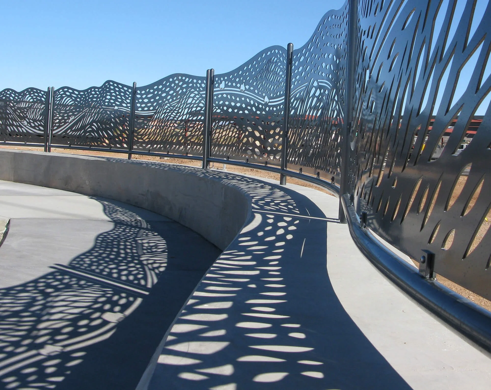 A plaza on the outskirts of Phoenix gives riders a comfortable place to wait for buses. Working with the project's design team, I developed a large outdoor plaza for people waiting for buses into Phoenix. The design includes large-scale shade screens, decorative railings, and seating. The main shade screen provides shade and seating for passengers, and creates a grand entry into the site. The cut-steel screens and railings feature stylized images of routes down out of the surrounding foothills, into the traffic interchanges that can be seen from the site. The artwork’s title comes the song by Supertramp.